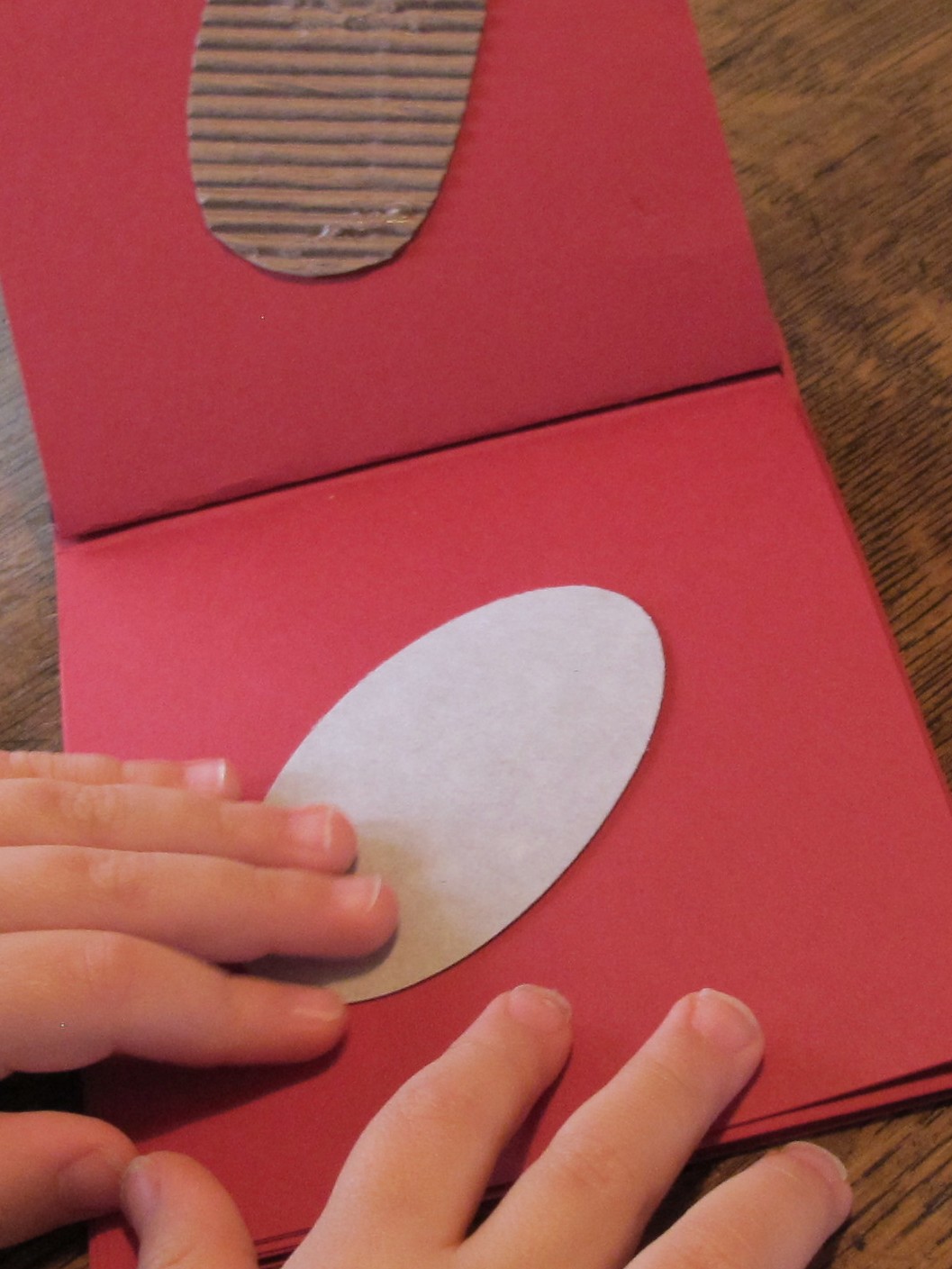This book would be great with just the bumpy shapes, or you could also add the smooth shapes like we did. For the smooth shapes, we used the back of some boxes in our bin. After this book was already finished, I thought that I might like the look of paper grocery bags better, since the color is exactly the same as the corrugated cardboard. This picky detail doesn’t matter to my son though. Anything smooth works fine!