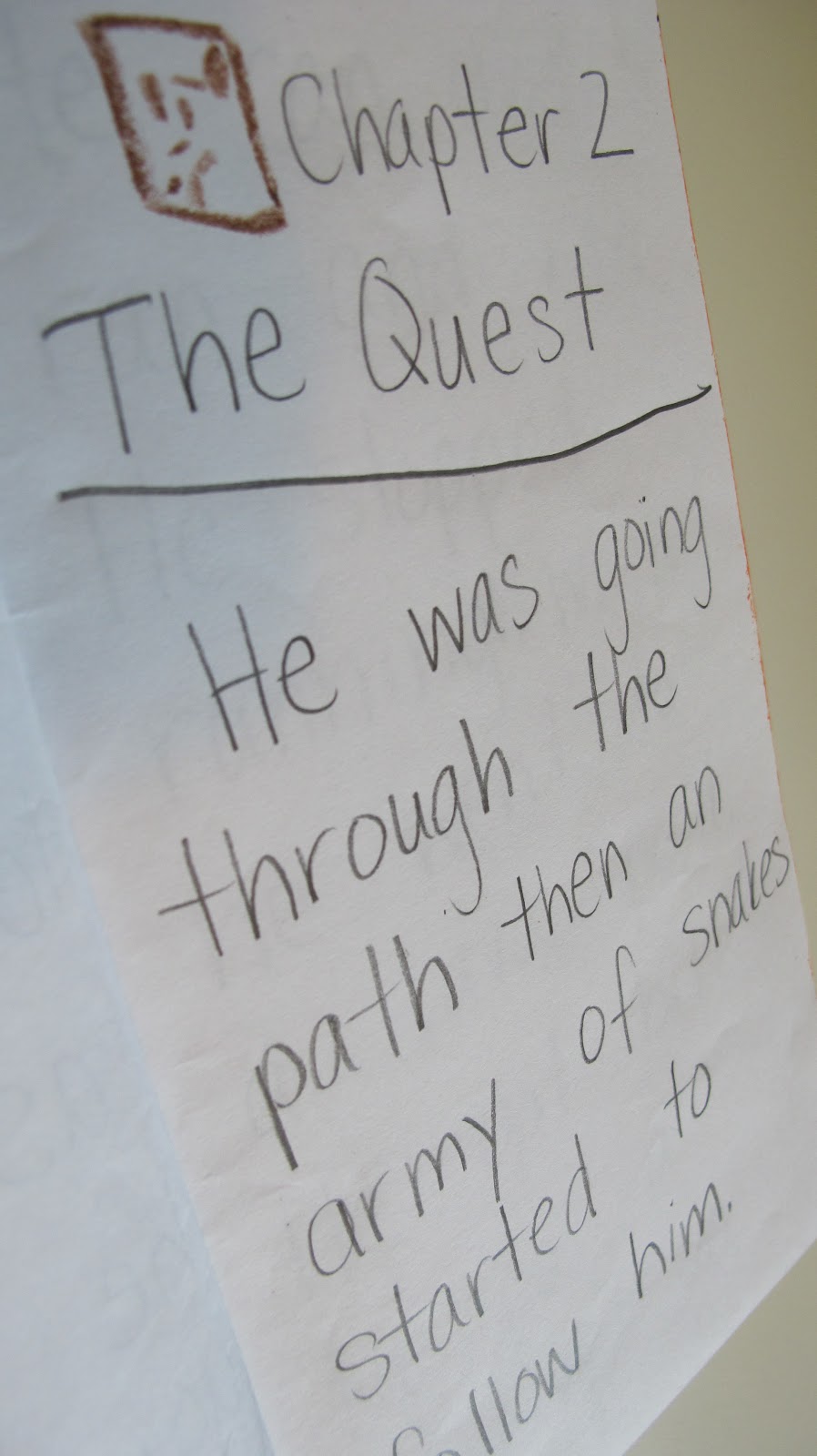 Here’s one recent example. This story was written by my six year old. Technically I did the writing, because he was so excited about the story that he wanted to act it out while he dictated it to me. (Acting out a story before/during writing is a great strategy to get the ideas flowing, btw.) I wrote exactly what he said, and he loves the finished product because it contains lots of wonderfully gross, disgusting action. Since most you aren’t kindergarten-aged boys, I spared you the gruesome parts. 🙂 You’re welcome!
