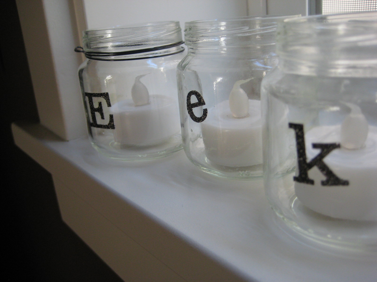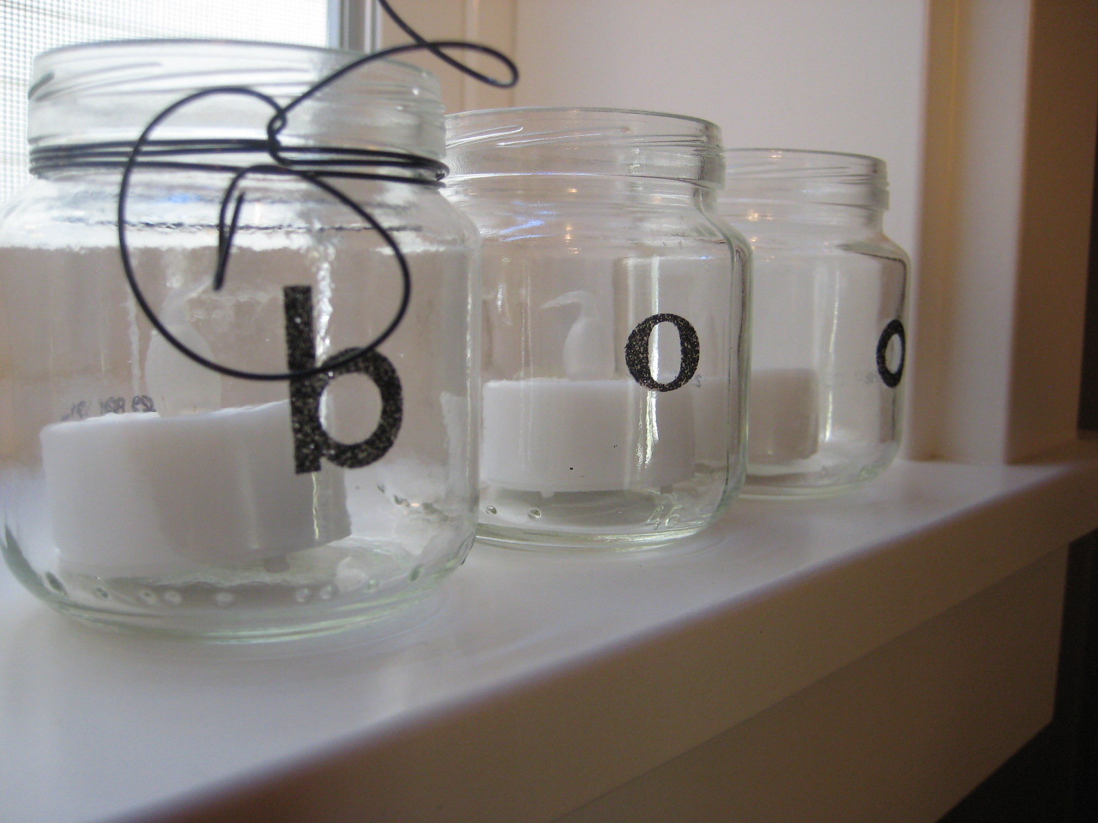To make them, my Halloween-obsessed son brainstormed some spooky words. (We’d just read the story Eek-a-Boo, so those words were on his mind.) I told him how to spell the words, and he attached the stickers and dropped in the battery operated candles. Real candles would work too, but they’re not as fun for kids to play with. 🙂 -Not that kids should technically be playing with the battery candles either, but you know what I mean. Anyway, last I attached the wire for a little flair. My son loves them and spends quite a bit of time enjoying the glow of the fake candles in our dark, spooky bathroom.