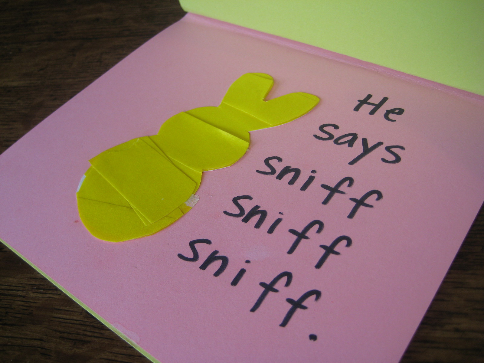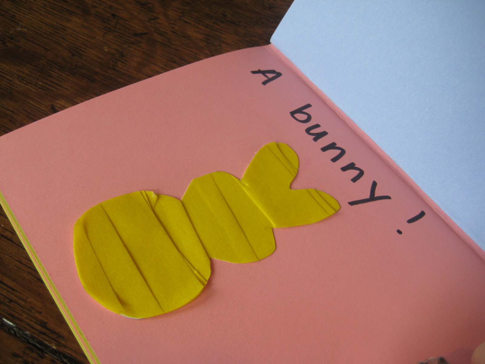We also did a variation of this super fun masking tape sticker activity from Creature Comforts. (This might be my new official favorite craft, btw. It’s so easy, and Washi Tapeis big fun.) We used the tape technique to make bunnies for our new favorite bunny book. For the words of the story, I just asked my son to tell me what each bunny was doing and I wrote his responses. Again, my two year old loved the project and could have taped all day. Although it looks like the two year old also cut out the bunnies, that was actually me. I was rushing because he was excited to move on to the sticking phase.