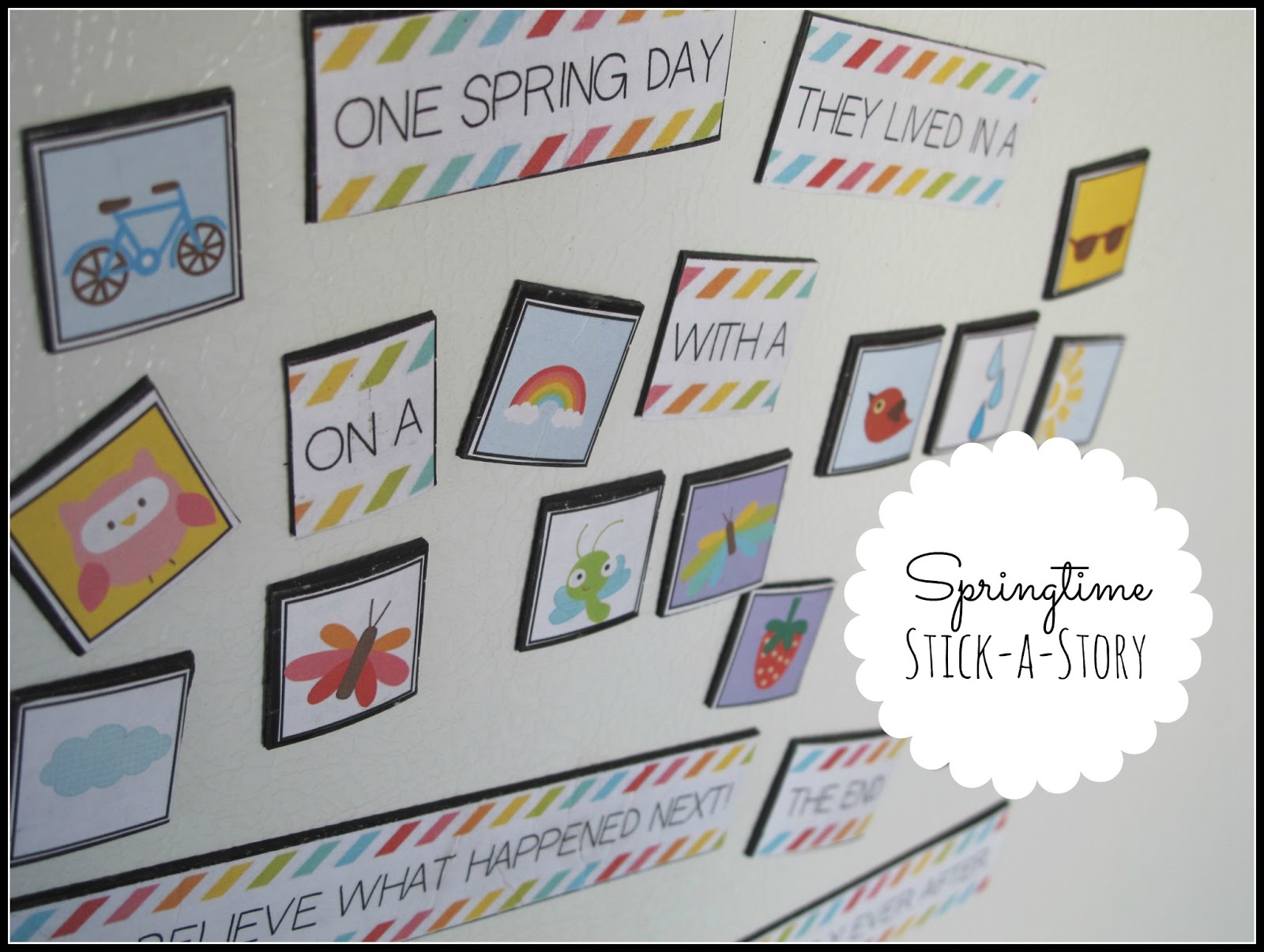 Kids can use the pictures and story words to tell their own spring stories. If you have a magnetic whiteboard, write words to complete the story. If you’re working on the fridge or another non-writable magnetic surface, just place the pictures and word magnets, then tell the stories orally, filling in the details as you go.