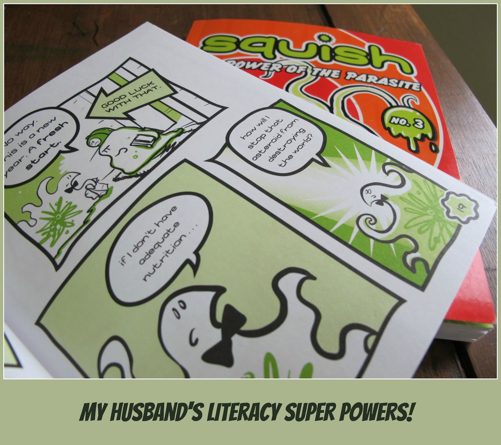 My husband also rocks in the comic book reading department. He reads them like they’re supposed to be read. I just can’t. As hard as I try, I don’t make the right sound effects, I often read the little boxes and bubbles out of order and I just don’t love them as much as everyone else in my house. My husband is a pro, and because of this, my boys have discovered a whole new favorite genre. They now choose graphic novels over pretty much all else, and for that, I totally credit my husband and his goofy sound effects and voices.
