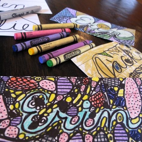 Doodle Cursive: The flowing connected lines in cursive fit right in with the art of doodling. I’ve always been a doodler but last summer after reading a post about Zentangle doodles on Imagination Soup, I introduced it to my kids. For this little project pictured above, I wrote my sons’ names for them on sentence strips and we just doodled around them to make bookmarks. Kids who are proficient in cursive can obviously do their own writing, but since two out of three of my boys don’t know cursive yet, this worked best for us.