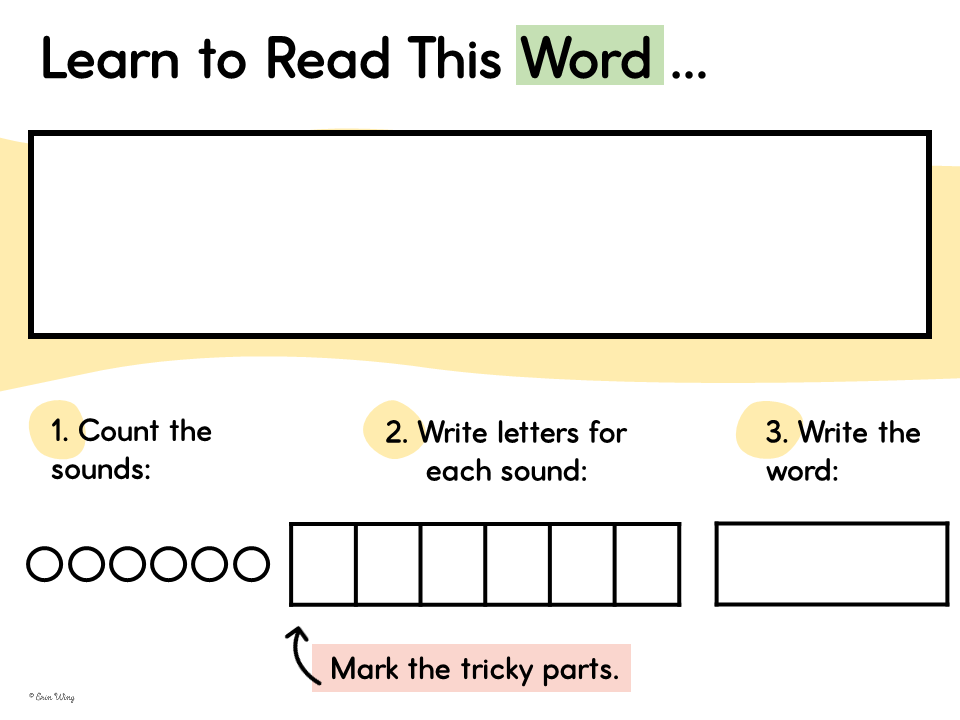 It’s fine to just write the words on a piece of scrap paper, or a whiteboard. I like to use grids to visually break up the word with one sound per box. This method is called phoneme grapheme mapping.